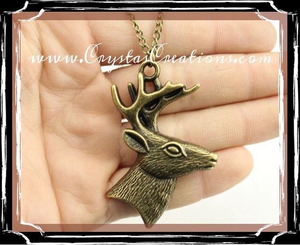 This is a really unique Deer head profile necklace. The chain is made for easy on/off over the head. It measures 27-28 inches in length. No clasp to fumble with. A cool way to commemorate a first trophy deer, or a father/son or daughters first deer of the season! Or if you are like me, and think Deer are just a beautiful animals. Whatever the reason, this is sure to delight! Pendant measures approx. 2.5 inches high X 1.5 inches wide. That’s a nice size! Material: Metal Alloy Color: Gold/Bronze Tone Chain Style: 27-28 inch length