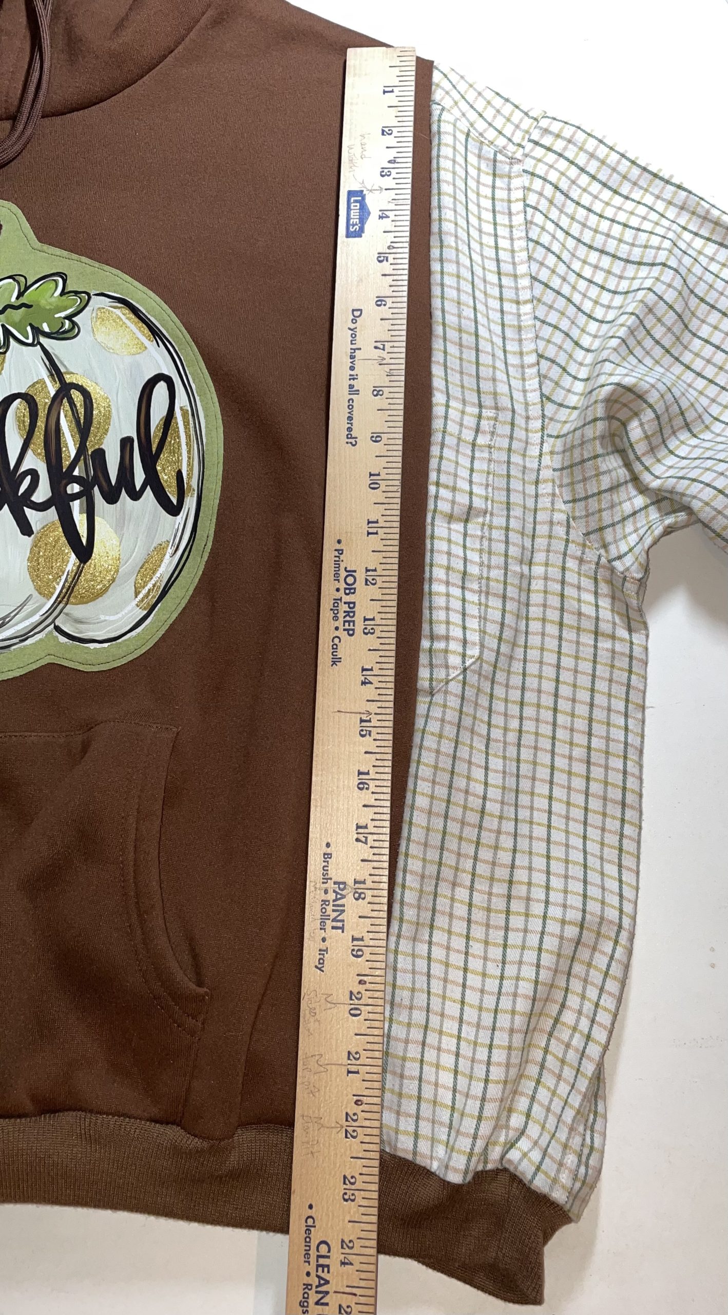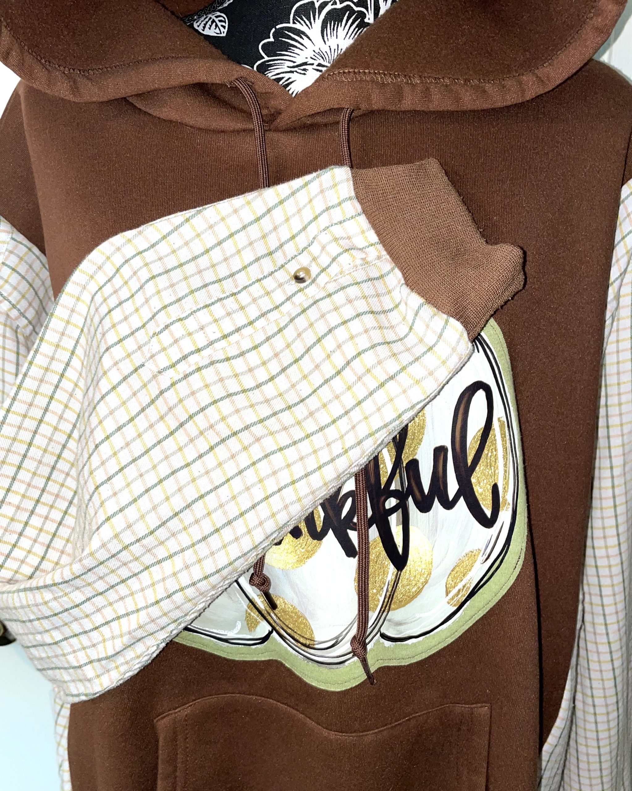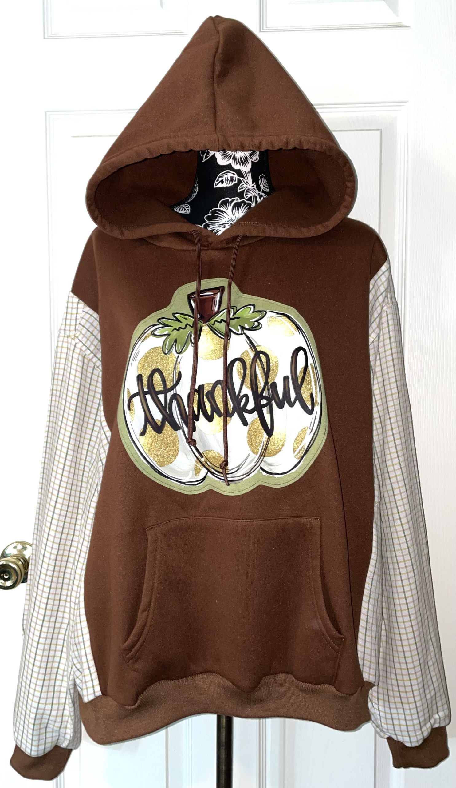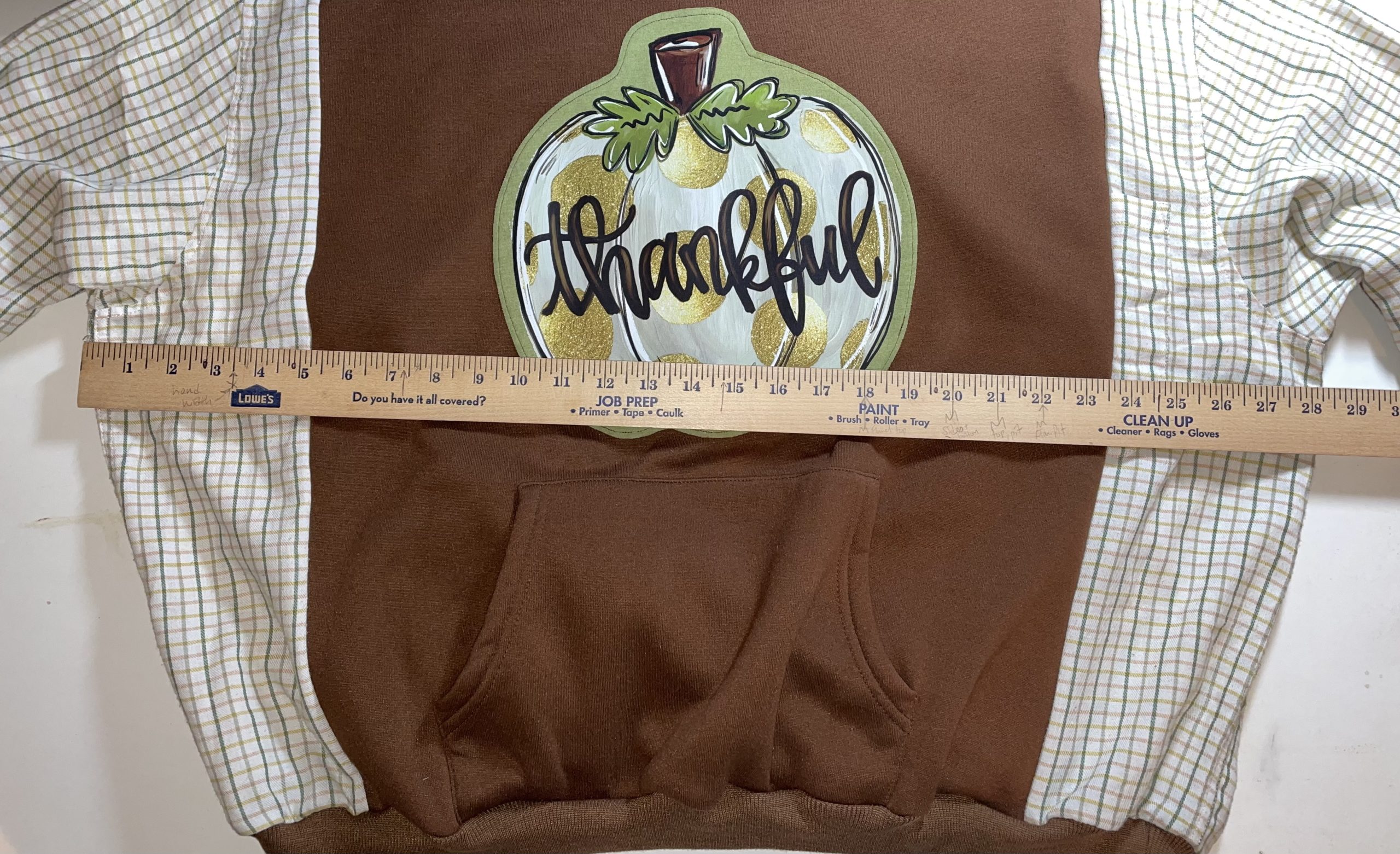 “Thankful” upcycled hoodie that features a chestnut brown hoodie (shein brand) that I paired with a new lightweight flannel shirt in a small plaid pattern. I added a beautiful white pumpkin with gold pokadots decal that came off another shirt. Has a kangaroo pocket. It’s super soft and cozy inside. It fits like an adult L/XL but has a length of a Medium in my opinion. I like things to cover my backside fully so that’s why I say it has the length of a medium shirt. On me it hits right below the hips, but not all the way to cover my backside where I prefer it to be. But I know everyone is different and has their own preference. This would be a great item to wear around the holidays or sure.