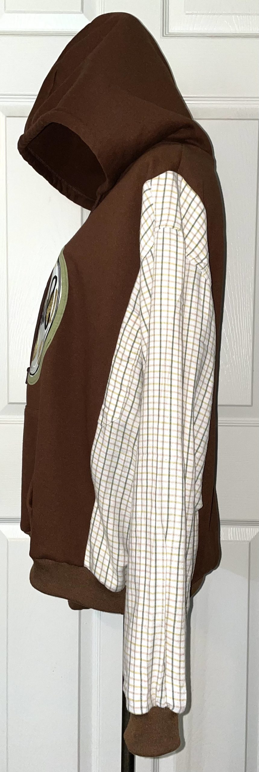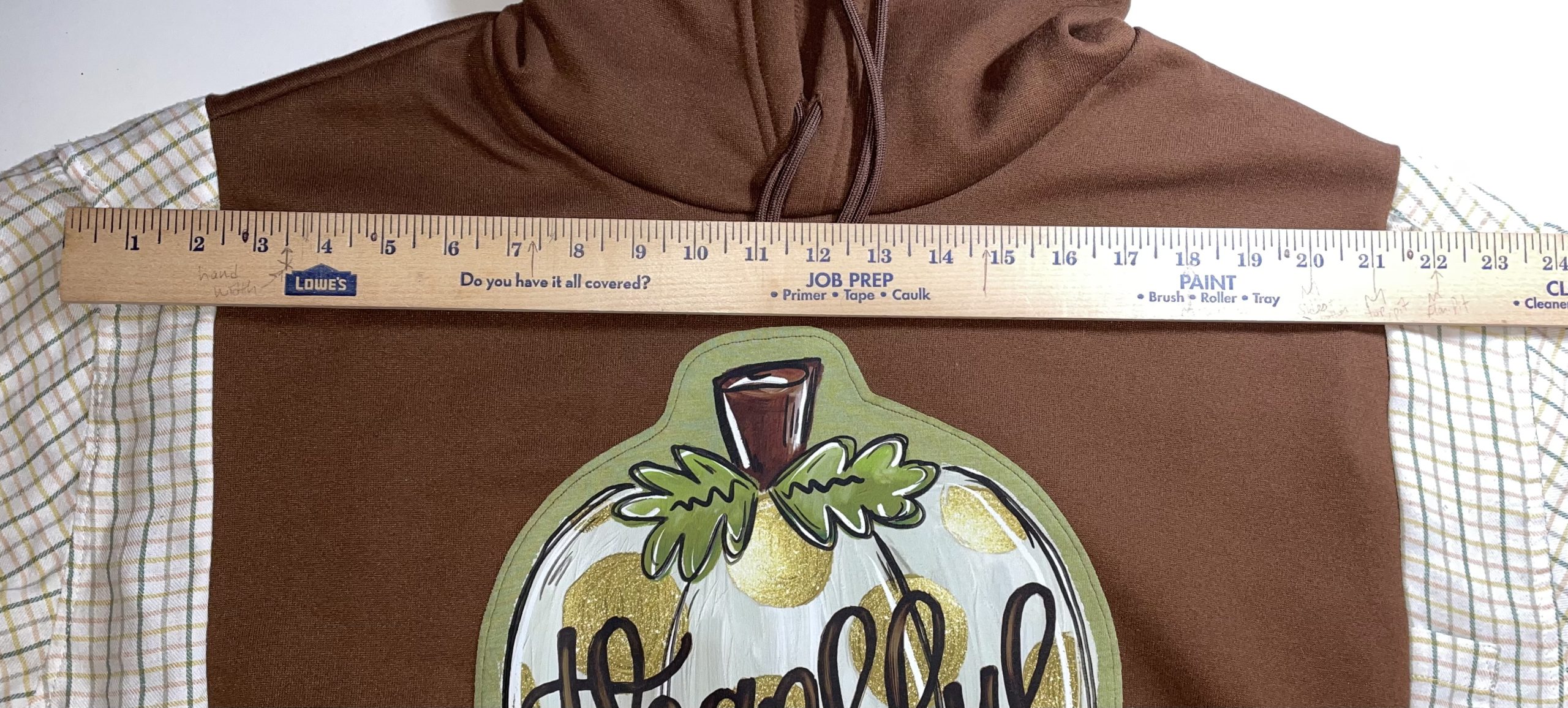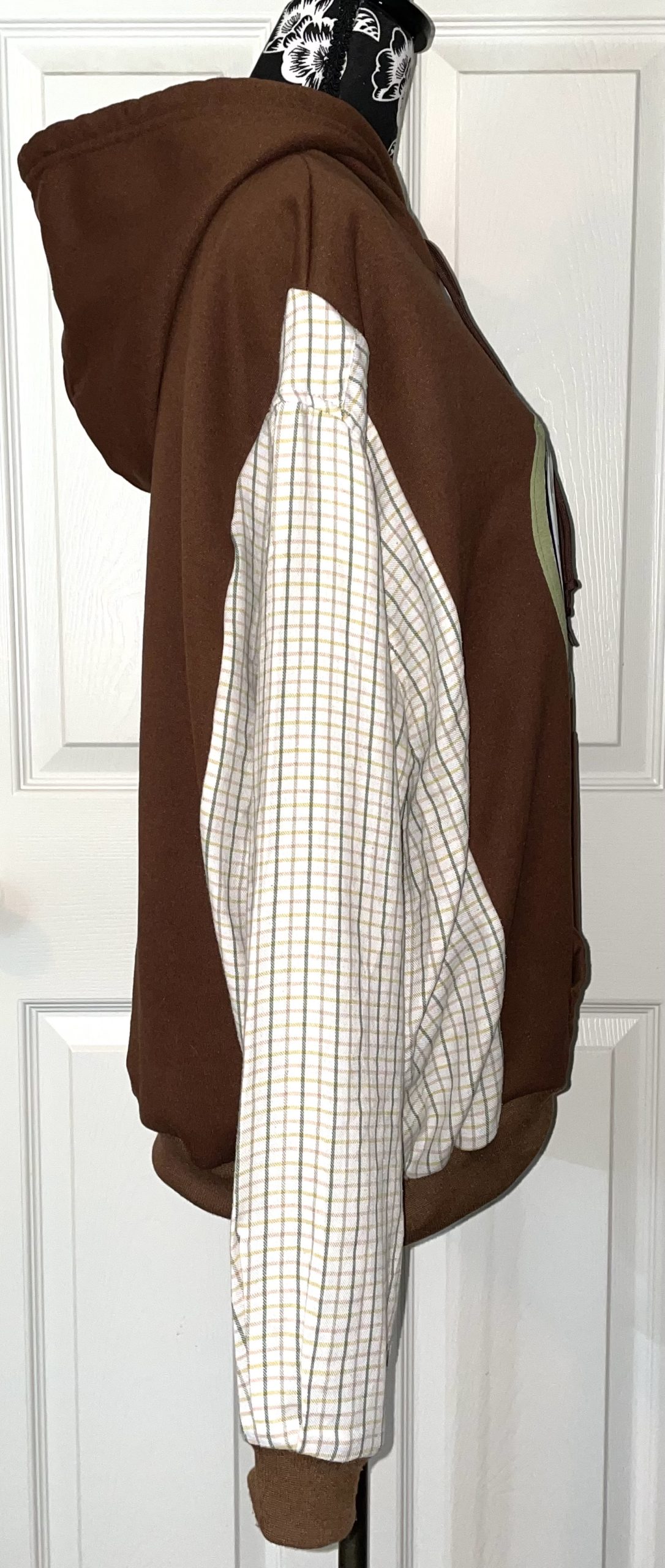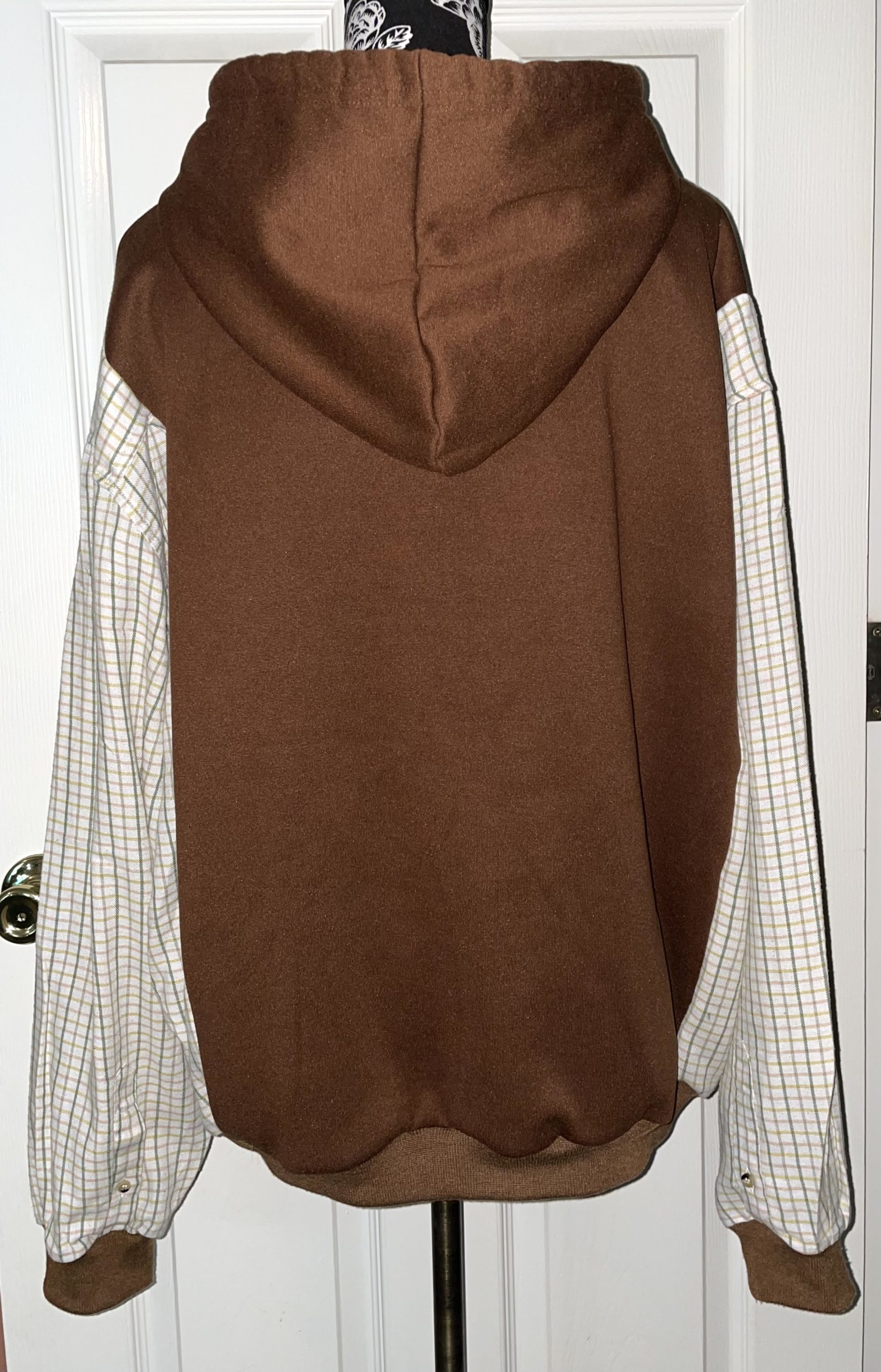 “Thankful” upcycled hoodie that features a chestnut brown hoodie (shein brand) that I paired with a new lightweight flannel shirt in a small plaid pattern. I added a beautiful white pumpkin with gold pokadots decal that came off another shirt. Has a kangaroo pocket. It’s super soft and cozy inside. It fits like an adult L/XL but has a length of a Medium in my opinion. I like things to cover my backside fully so that’s why I say it has the length of a medium shirt. On me it hits right below the hips, but not all the way to cover my backside where I prefer it to be. But I know everyone is different and has their own preference. This would be a great item to wear around the holidays or sure.